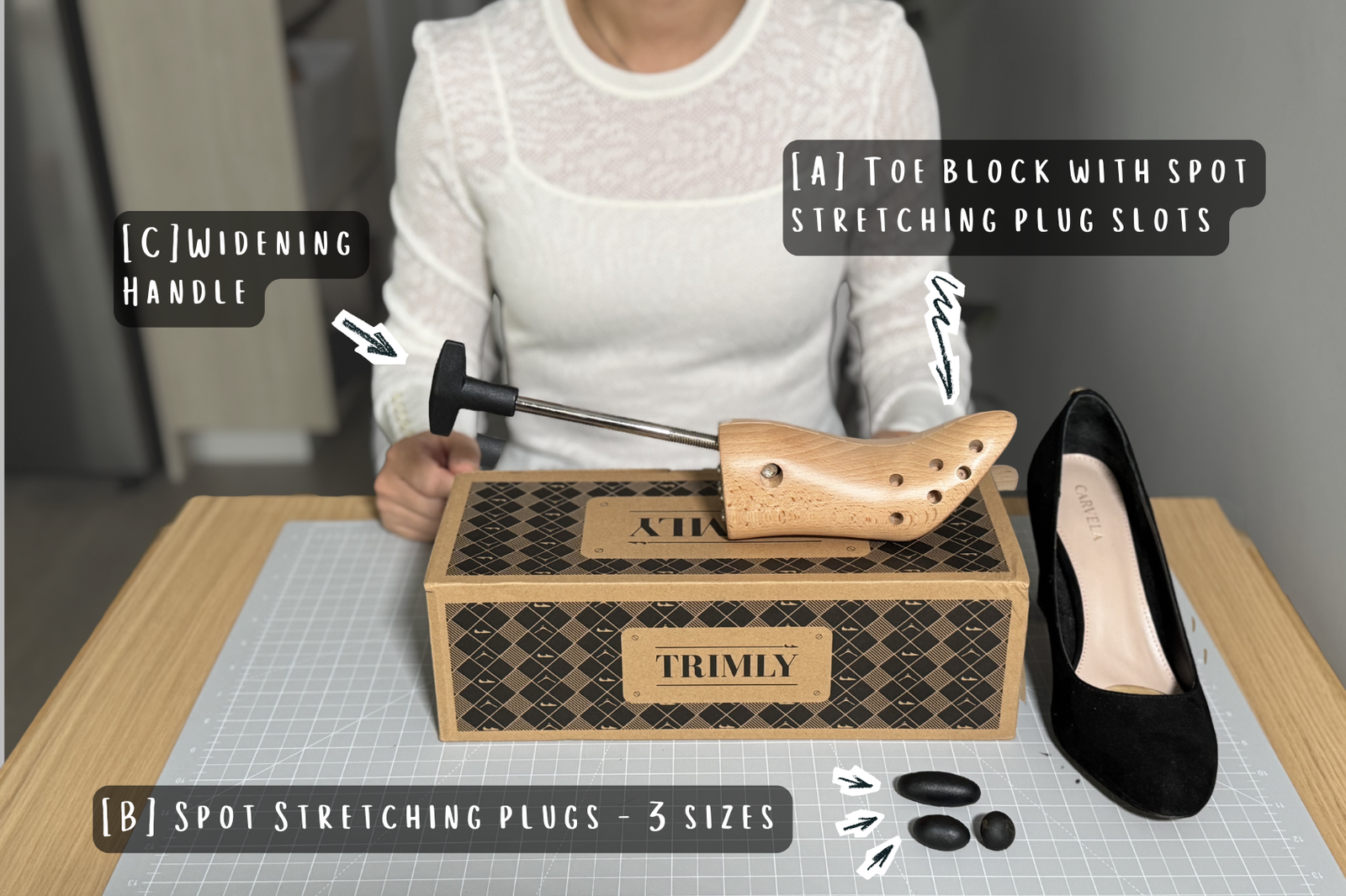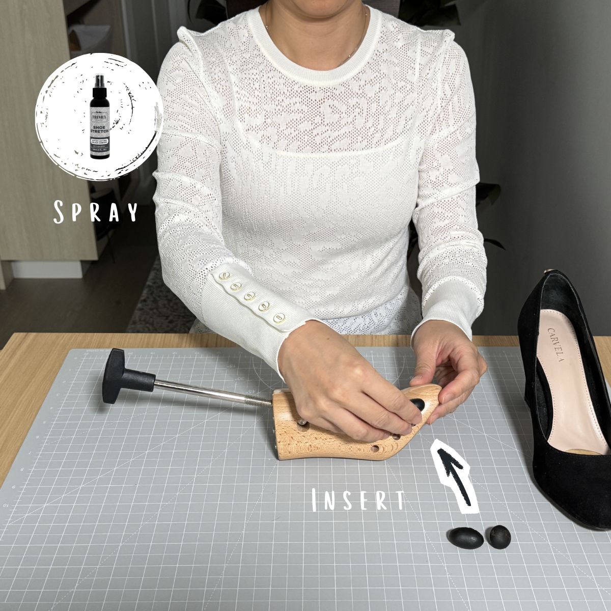 Apply Trimly Shoe Stretch Spray inside the shoe, focusing on the areas that feel tight or pinch. This softens the leather so it stretches more easily and evenly.
