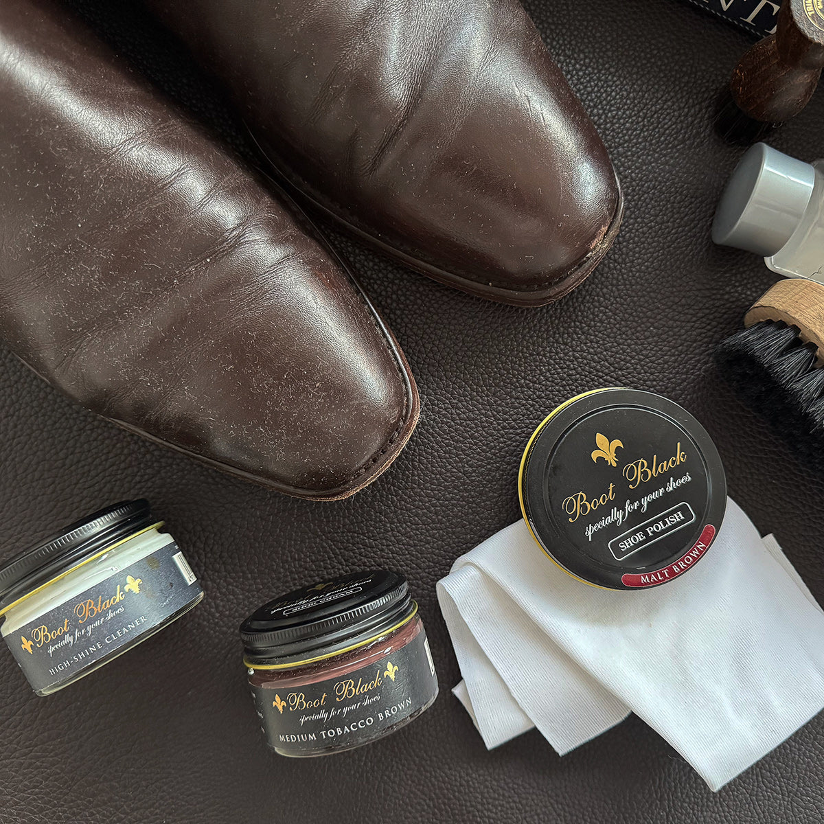 Cream polish adds a soft sheen. Wax polish adds shine. If you use wax, keep it to the toe and heel only. Across flex points it cracks, flakes, and looks tired quickly. Wax polish is a finish layer, not a substitute for cleaning or conditioning.